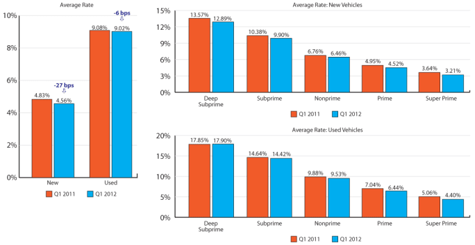 Interest rates for new-vehicle loans came in at 4.56 percent in the first quarter, down from 4.83 percent in the year-ago period. For used-vehicle loans, interest rates fell from 9.08 percent in the year-ago quarter to 9.02 percent in the first quarter.
