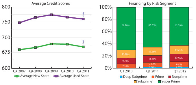 Since the third quarter 2011, scores have dropped three points for new-vehicle financing and 17 points for used. Looking at the first quarter 2008, the average credit score was 753 for new vehicles and 653 for used.