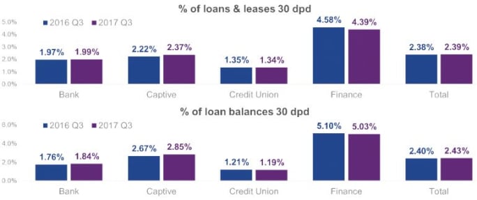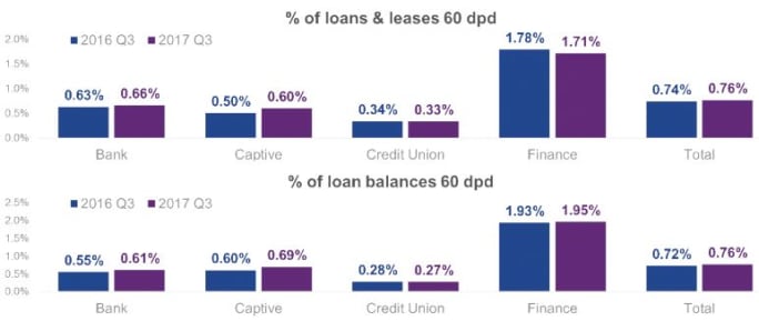 Considered a critical bellwether for the auto finance industry, both 30- and 60-day delinquencies for loans and leases combined were up slightly from the year-ago period. For 30-day delinquencies, the rate increased from 2.38% in the year-ago period to 2.39%, while the 60-day delinquency rate inched up from 0.75% to 0.76%.