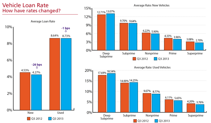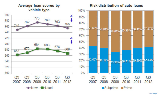 Average Credit Scores Fall With below-prime loan originations growing, the average credit score for new- and used-vehicle loans dropped. For the third quarter, average consumer credit scores for new-vehicle loans fell by eight points from 763 in the third quarter 2011 to 755. Average consumer credit scores for used-vehicle loans also fell, from 676 in the year-ago period to 668.