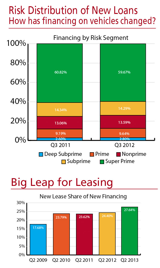 Experian Automotive’s third-quarter data showed more positive signs: Credit scores fell to prerecession levels, and finance sources increased their average amount financed. They also continued to welcome car buyers with below-prime credit. But the biggest indicator of the auto finance market’s health was the 7.53 percent year-over-year uptick in new-vehicle leasing
