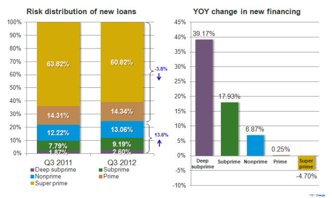 Nonprime grew from a 12.22 percent market share in the third quarter 2011 to 13.06 percent in the third quarter 2012. Subprime share grew from 7.79 percent to 9.19 percent, while deep subprime’s market share grew from 1.87 percent to 2.6 percent.