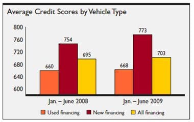 When we examine the characteristics of financing in the first half of 2009, the tightening of the credit markets is most evident in the increasing credit scores for both new- and used-vehicle financing. The average credit score for vehicles financed in the first half was 703, an increase of eight points.