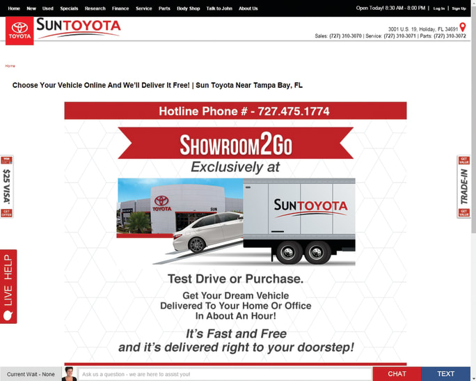 Once a customer settles on a vehicle, he or she can request that Sun Toyota deliver it to a home or office for a test drive, along with the necessary paperwork to complete the transaction. The service is free for customers living within an hour and a half of the dealership.