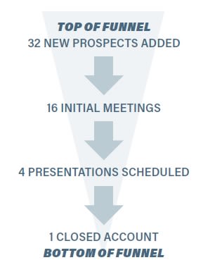 It’s typically much easier to schedule an initial, fact-finding meeting, or even to have one on the spot if you are prospecting in person, than it is to secure a presentation or signed agreement. Therefore, the 4-to-1 ratio may not apply to how many prospects you need to dump into your sales funnel each month. Let’s say 50% of the time you attempt to engage with a new prospect, you are successful in scheduling an initial meeting or gathering information that you can leverage to illustrate why they should meet with you. In that example, you would need to add 32 new prospects into your sales funnel each month. You will eventually get better at pinpointing these specific numbers based on your own individual sales skill and success. However, if you plan conservatively, you will be better off. The worst thing that would happen is closing more business than you anticipated. That’s a great problem to have.