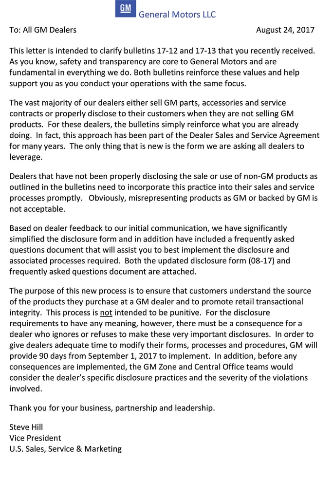 “Instead, the program appears to be an attempt to coerce dealerships into selling GM-branded products and service contracts, even in situations where a customer would be better served with a third-party option or where there is not GM equivalent,” the letter continues. “Indeed, using inflammatory language that implies that a part ‘may damage the vehicle, compromise its compliance with safety standards, or void the GM Warranty on the vehicle” only serves to highlight that appearance of impropriety.”