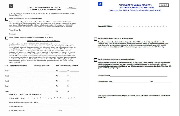 As for the disclosure form, GM requires that it be presented and signed by the customer during the sales or service process. Dealers must also keep a copy of the form in the customer’s sale or service file, along with copies of the purchase order or bill of sale.