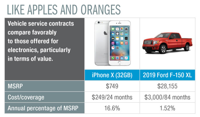 By percentage, AppleCare protection is 11 times more expensive to purchase compared with adding a vehicle service contract to a Ford F-150. Yet the new truck is 38 times more expensive, has many more systems and components, all fed by more than 100 million lines of code. Smartphones top out at around 15 million.