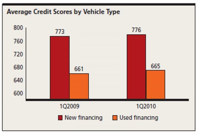Credit scores came in higher in the first quarter than in the year-ago period. Last year’s new-vehicle scores experienced considerable year-over-year increases, but tapered off to a consistent level throughout the year. During the first quarter 2010, the average score on new-vehicle financing was 776, a three-point increase from first quarter 2009.
