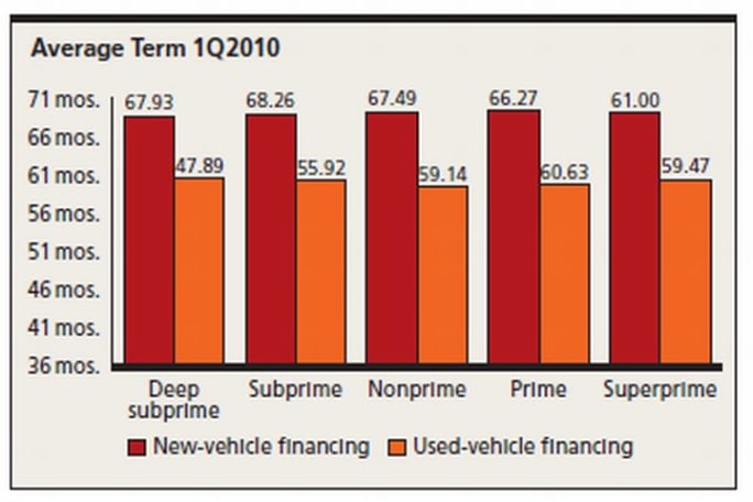 Throughout 2009, average term for used-vehicle financing on deep subprime loans experienced dramatic decreases. That changed in the first quarter, with terms for this segment increasing 0.22 months to an average of 47.89 months. That wasn’t the case for the subprime tier, however, which decreased by 0.53 months to an average term of 55.92 months in the quarter.