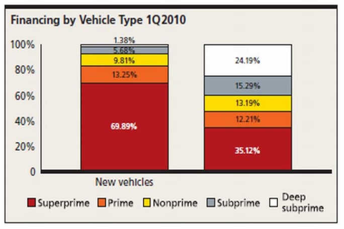 Along with higher credit scores, the overall distribution of vehicle financing continues to shift into the prime and superprime risk segments, with more than 59 percent of all financing in the first quarter falling into these low-risk segments — up 2.9 percent from last year. Deep subprime now represents only 16.58 percent of all vehicle financing, a decrease of more than 7 percent from first quarter 2009.