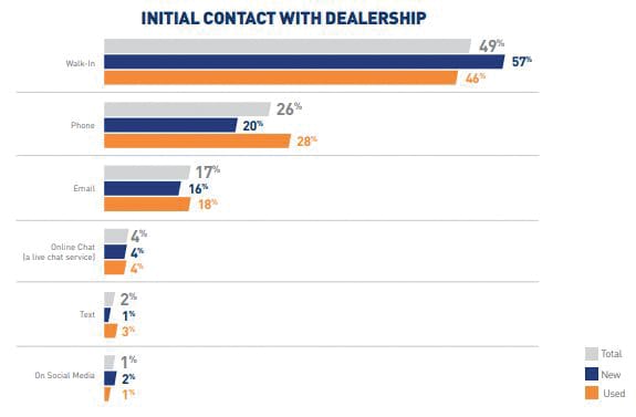 The good news for traditionalists, according to the Cox study, is half of the 2,050 car buyers surveyed were walk-ins, meaning they had no contact with the dealership prior to their first visit. To put that in perspective, only 26% listed a phone call as their first contact, and only 17% said email.