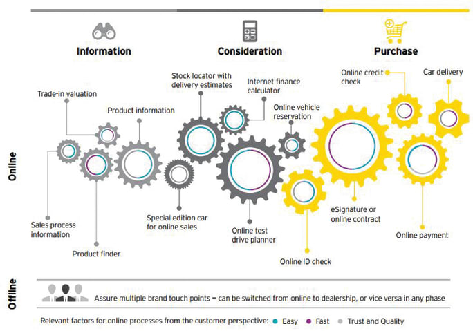 The problem, at least according to EY (Ernst & Young)’s “Automotive retail 2030,” is more than 80% of dealers do not plan to expand their online presence by 2020. “While a customer presently prefers to purchase a vehicle offline, a large part of the purchase journey is already digital,” EY’s report states, in part. “Yet most dealers do not plan to invest in increasing their presence online. They do spend a significant amount on marketing to acquire customers; however, most times there is a wide gap between the dealer’s perception of their current initiatives and the actual customer experience.”