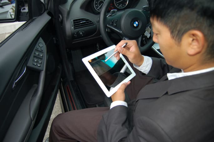 South Bay BMW’s John Kim demonstrates the lease-return feature equipping BMW Financial Services’ InfoBahn Mobile.