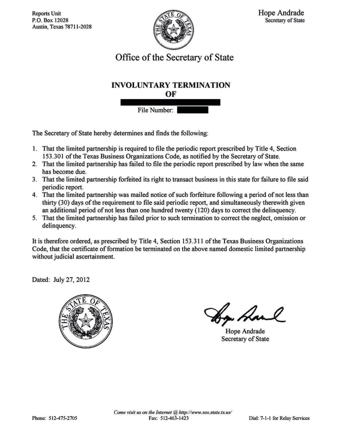 Texas Secretary of State Hope Andrade sent this notice of involuntary termination to a dealer who essentially forfeited the right to their store’s name by failing to heed an “entity vital” requirement.