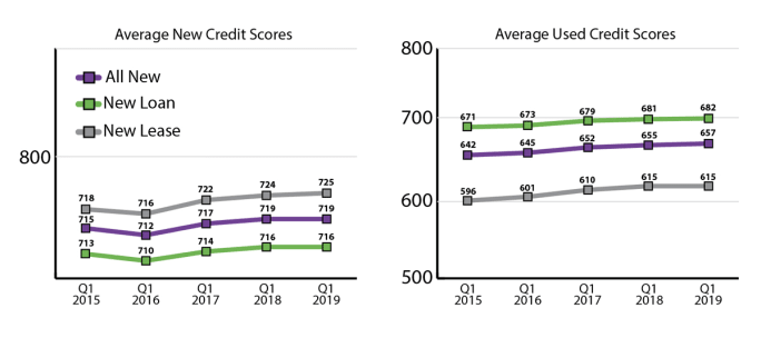 Q1 2019 showed growth for average credit scores for used auto loans. All used lending saw the average score increase two points to 657. Meanwhile, franchise used credit scores are up one point to 682 while independent used remained 615.