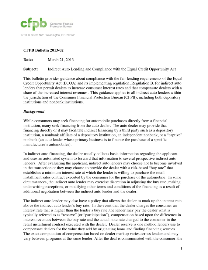 Due to the National Automobile Dealers Association (NADA)’s hard-fought exemption for new-car dealers, the bureau opted for an ECOA-based supervision and enforcement approach laid out in its controversial guidance on dealer participation. An internal memo shared between bureau officials days after the regulator published its compliance bulletin on March 21, 2013, would reveal that rulemaking aimed at banning markups or forcing dealers to disclose them to consumers was back on the table.