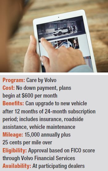 That’s true for Volvo, which is using Care by Volvo to make owning its 2019 XC40 — the automaker’s first luxury compact SUV — “as easy as having a cell phone.” All-inclusive pricing of a well-equipped model starts at $600 per month for a two-year subscription. The program allows customers to change cars and sign up for a new 24-month subscription as early 12 months into their agreement.