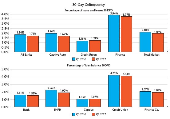 And despite the subprime pullback, every finance segment registered year-over-year growth in their open automotive loan balances. Leading the way with growth of 15.39% were credit unions, followed by finance companies at 6.08%, banks at 6.06%, and captive finance companies at 3.77%. The following is a look at some of the trends that shaped the auto finance industry in 2017’s opening quarter.