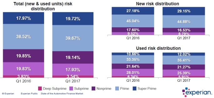 Well, that pendulum definitely swung away from the high-risk tiers during the first quarter, with the total share of subprime and deep-subprime loans dropping from 26.48% in the year-ago quarter to a 10-year low of 24.1%.