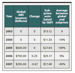 If you graph out the default rates among different ages of ABS, there are definitely some changes. But take a look at the difference in capital flows over four years. We included the general data on all ABS issuance because subprime auto is a large and fragmented industry. It’s often difficult to determine how much of an effective proxy the rated ABS issued on Wall Street is:
