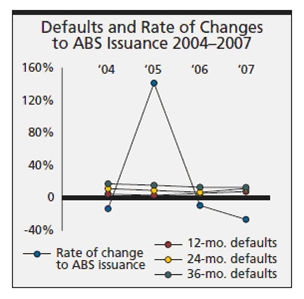 For data, we looked at the performance of ABS as rated by Standard & Poor’s from the year 2000, static-pool analysis of a portfolio of 5,000 RIC spread over Florida, Texas and the Midwest, unemployment data as published by the U.S. Department of Labor, and statistics on issuance of ABS domestically and globally as published by S&P and the Bank of England.