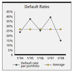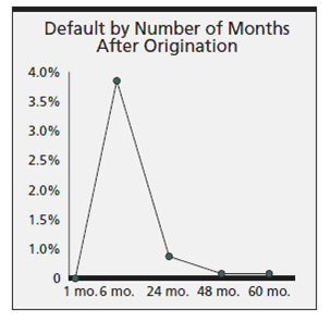 Rates of default in the portfolio peaked in the first six months and subsided afterward. In the third year, the rate of default is markedly less than the first two, and the age of the portfolio appears to be more statistically significant than the change in unemployment rates: