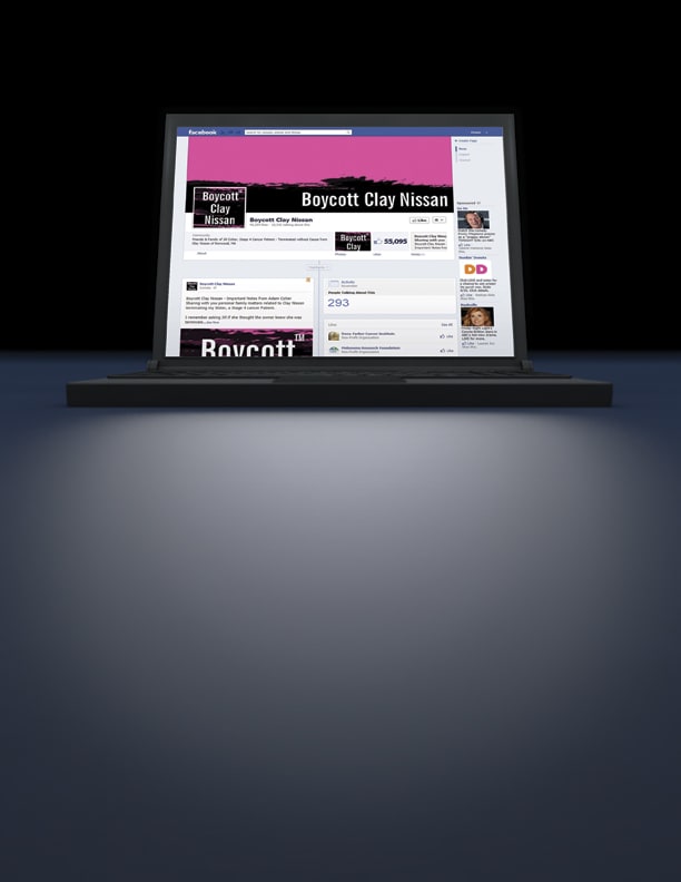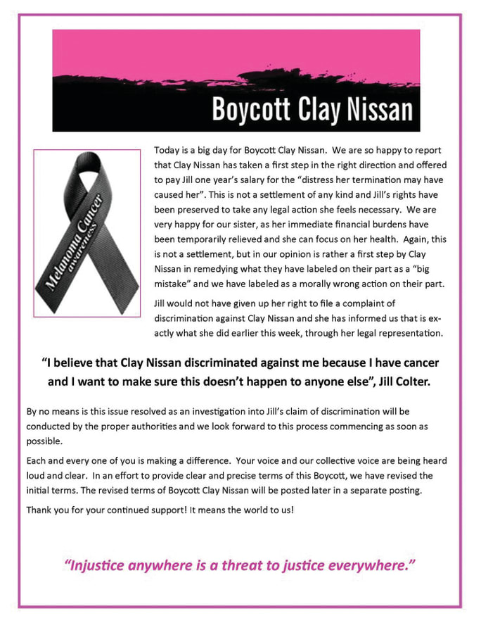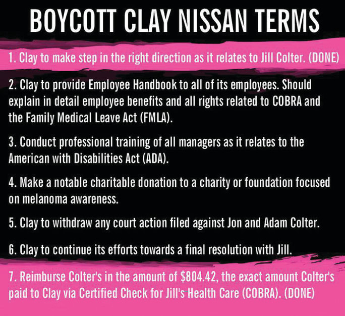 Let the Boycott Begin Adam and Jonathan Colter launched their “Boycott Clay Nissan” campaign on June 21, nine days after their sister Jill was dismissed. They created a Facebook page, a Twitter account, a website dedicated to the boycott, and posted a petition on Change.org. And Facebook commenters were quick to share their outrage for what happened to Jill.