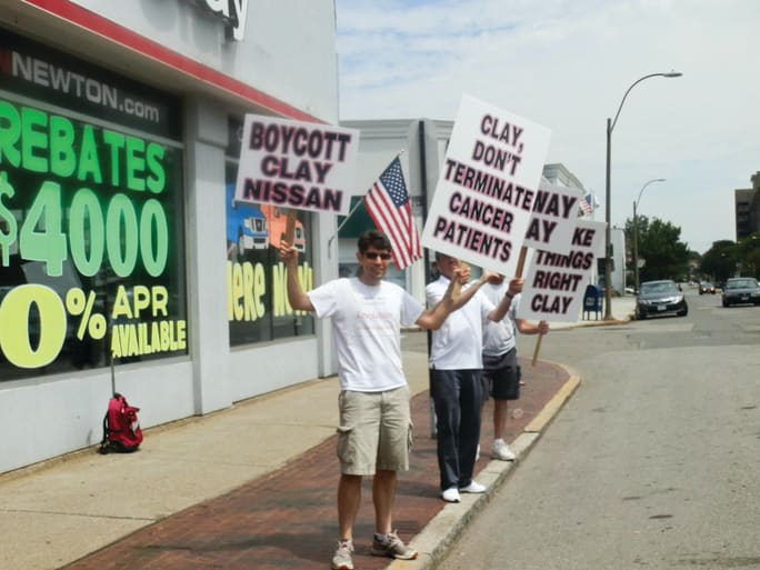 Adam and Jonathan Colter organized two separate protests this summer at Clay Nissan of Norwood, Massachusetts. The brothers claim the dealer fired their sister because she had cancer, charges the dealer has denied.
