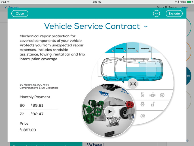 The interview section then feeds into product videos Zurich designed specifically for its new tool. For the service contract, the video will flash various vehicle components along with repair costs. The videos also point out which components can’t be repaired and must be replaced. From there, the tool pops up a screen that displays the deal the customer negotiated in sales, including the base payment.
