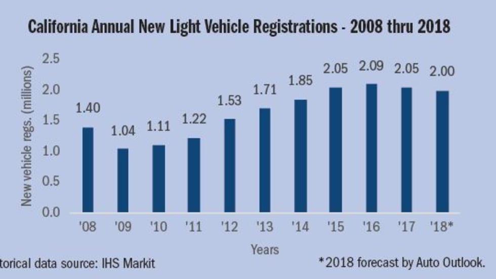 Despite the decline, the trade group expects the California market will end the year with around 2 million new-vehicle registrations. That would be a slight decline from the 2.05 million registrations the market recorded in 2017, providing further proof the market has plateaued after several years of big increases.
