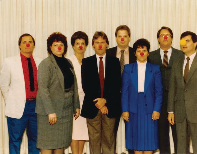To the right is a photo Ron Reahard’s 1986 F&I class. David Ressler, standing to the left in his red, white and blue suit, purchased clown noses for the occasion. Reahard can be seen standing to the far right wearing a yellow clown nose.
