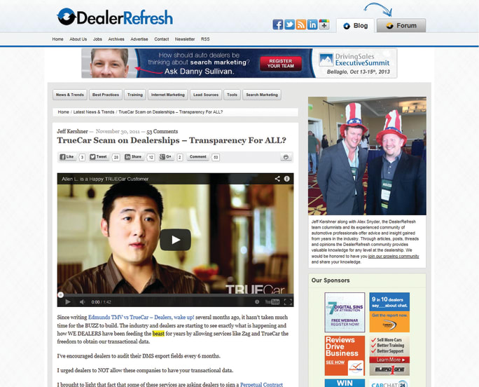 The blogs, penned by both dealership employees and vendors, read like open discussions about TrueCar and related issues. And those who read and commented on the blogs were not decision-makers in their companies, at least from what I could tell. Most of us were protesting TrueCar’s extraction of customer data from its clients’ dealership management systems, its defaming of auto dealers in commercials and derogatory websites, Scott Painter’s relentless media appearances, in which he continued to defame auto dealers to further the company’s agenda, and, finally, our belief that TrueCar was acting illegally as a broker by pricing cars.
