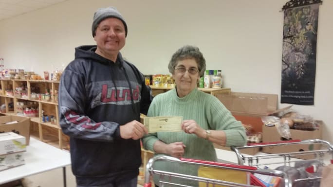 G.P. Anderson hands a check to Wadena Food Shelf Director Mary Ann Hagen.