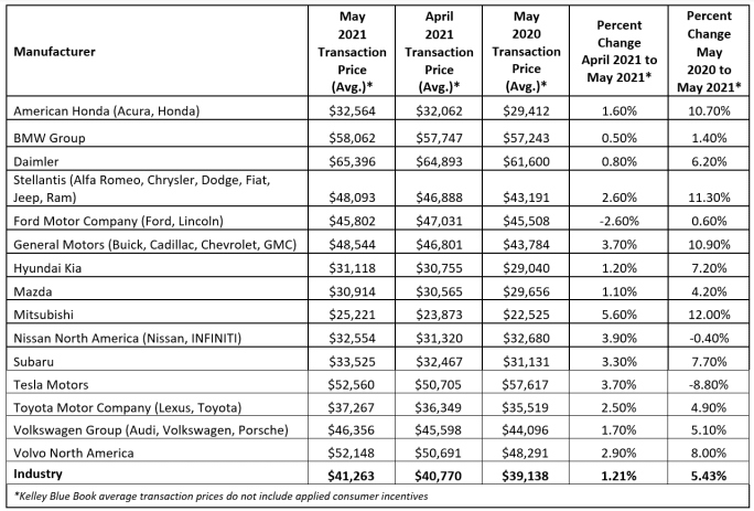 IRVINE, Calif. – The estimated average transaction price for a light vehicle in the United States was $41,263 in May 2021, according to the analysts at Kelley Blue Book. New-vehicle prices increased $2,125 (up 5.4%) from May 2020, while increasing $493 (up 1.2%) from April 2021.