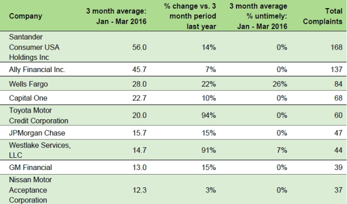 The bureau’s complaint report also contained a list of most-complained-about companies, which included Santander, Ally Financial, Wells Fargo, Capital One, Toyota Motor Corp., JPMorgan Chase, Westlake Financial Services, GM Financial, and Nissan Motor Acceptance Corp. The companies listed, according to the bureau, account for 50% of all auto finance-related complaints “sent to companies for response in January to March 2016.