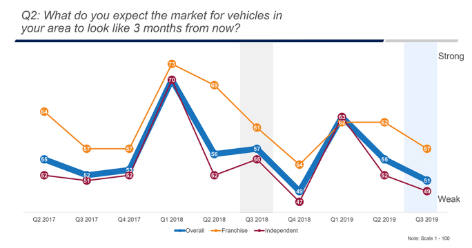 Franchised dealers, for example, feel the current market is strong, with an index score of 56, a two-point increase from Q2. Independent dealers, on the other hand, feel the current market is weak, with an index score in Q3 of 46, a two-point decrease from Q2.
