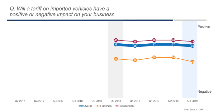 Both groups said costs continue to rise but agreed the threat of tariffs on imported vehicles and parts impacting their profitability is their most negative concern. Overall, only 8% of automobile dealers in the U.S. believe tariffs will have a positive impact on business profitability. Conversely, nearly six in 10 franchised dealers believe the impact will be negative. Independent dealers are more likely to see tariffs as having no impact on their business.
