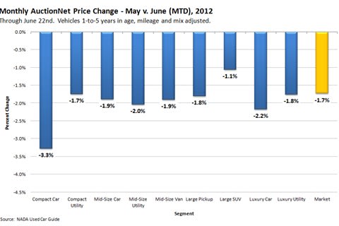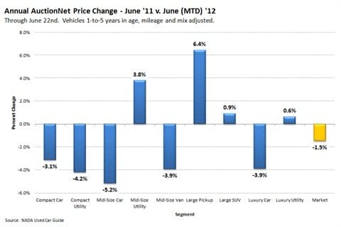 Compared to last June, market prices were at a 1.5 percent disadvantage, which isn’t a surprise since used prices remained elevated into July of last year because of new-vehicle substitute demand stemming from Japan’s natural disasters. “We can expect to see this inverted relationship in prices remain in effect until at least until August, which is when market prices took a dive in 2011,” Jonathan Banks, executive automotive analyst for the NADA Used Car Guide, wrote.