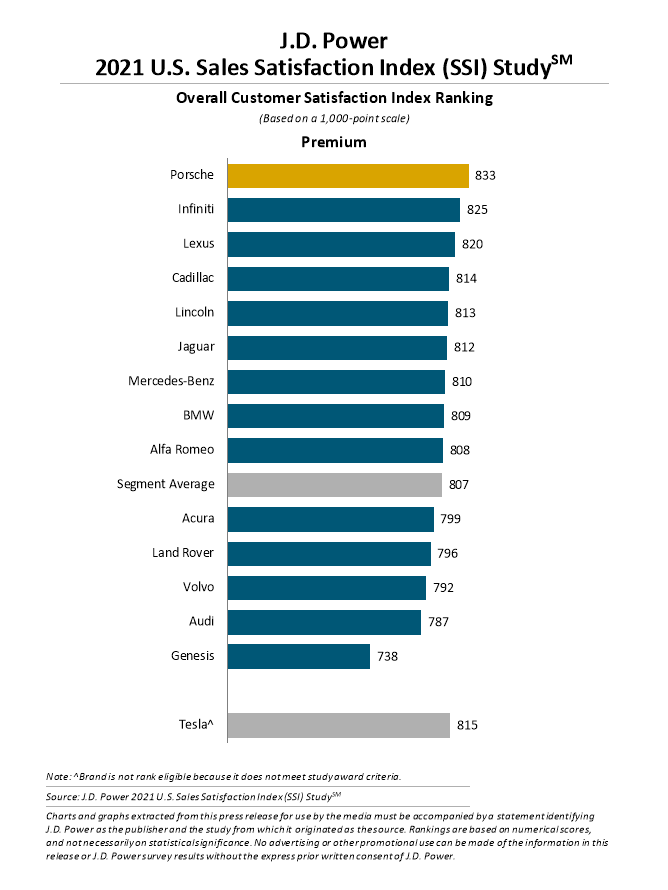 Porsche ranks highest in satisfaction with dealer service among premium brands with a score of 833. Infiniti(825) ranks second, followed by Lexus (820), Cadillac (814) and Lincoln (813).