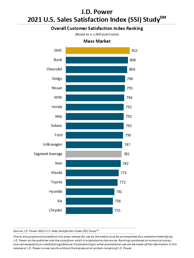 GMC ranks highest in satisfaction with dealer service among mass market brands, with a score of 812. Buick (806) ranks second, followed by Chevrolet (804), Dodge (796) and Nissan (795).
