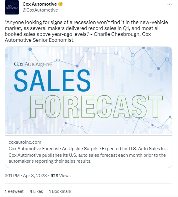 "Anyone looking for signs of a recession won't find it in the new-vehicle market," Cox Senior Economist Charlie Chesbrough tweeted.