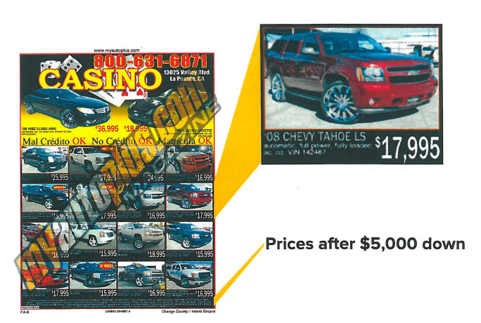 Specific violations found in Operation Steer Clear included promotions that specified low prices in the main portion of the ads when the price was actually $5,000 higher. Such ads, which stated in fine print that the low price was available to customers with a $5,000 down payment, were discovered in promotions for Casino Auto Sales of La Puente, Calif., and Rainbow Auto Sales in South Gate, Calif.