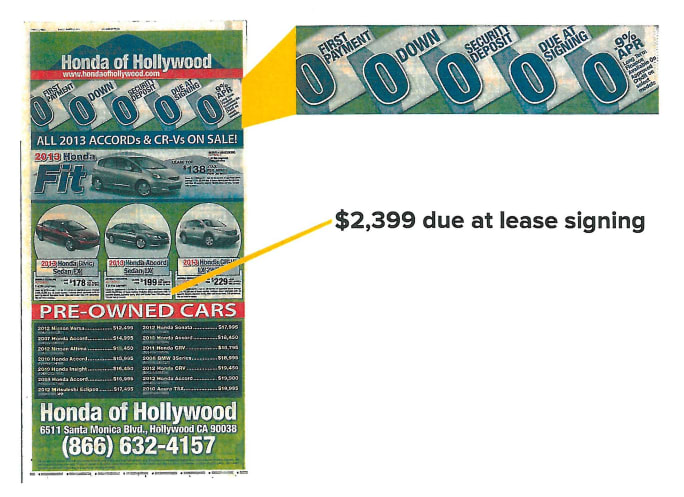 Honda of Hollywood (Calif.) and Norm Reeves Honda Superstore of Cerritos, Calif., were also charged with misleading customers. In one ad from the Hollywood store, the most visible text advertises zero upfront finance fees, while the fine print suggests additional costs of “$2,399 due at lease signing.”