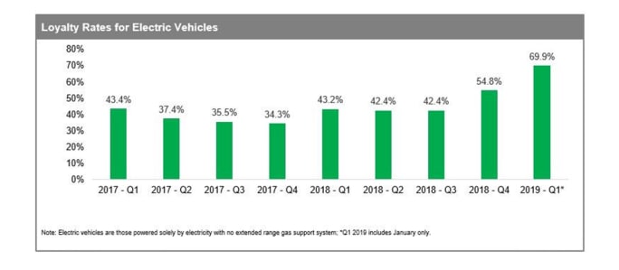 Loyalty rates for EVs are also on a growth trajectory with nearly 55% of all new EV owners who returned to market during the fourth quarter of 2018 purchasing or leasing another EV, up from 42% in the prior quarter. The trend continued in January, with nearly 70% of EV owners returning to market for a new EV during that month, analysts said.