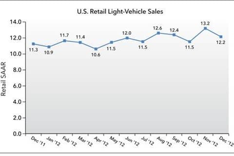 December new-vehicle retail sales are expected to total 1,152,500 units, which would put the seasonally adjusted annualized rate (SAAR) at 12.2 million units. Additionally, December’s selling rate is 500,000 units higher than the expected 2012 full-year rate.