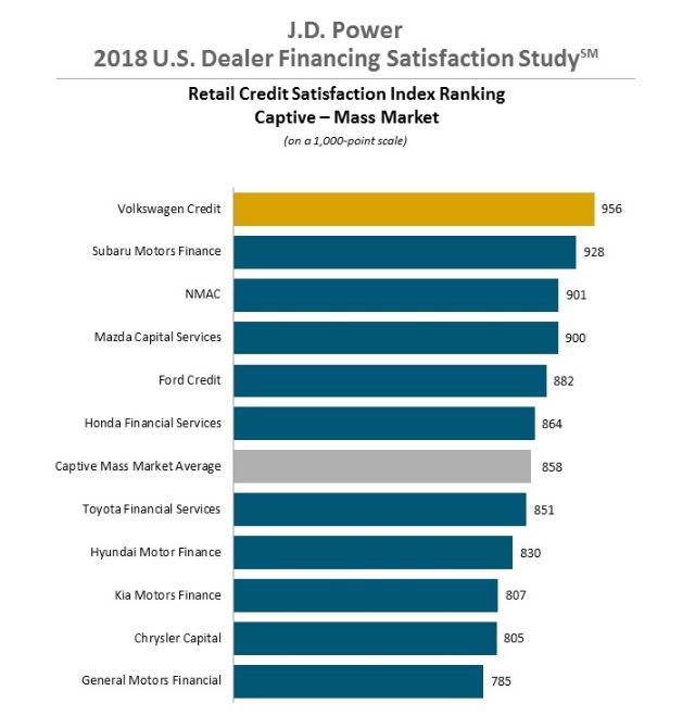 Captive Mass Market Segment: Volkswagen Credit ranked highest in overall dealer satisfaction (956), followed by Subaru Motors Finance (928) and NMAC (901).