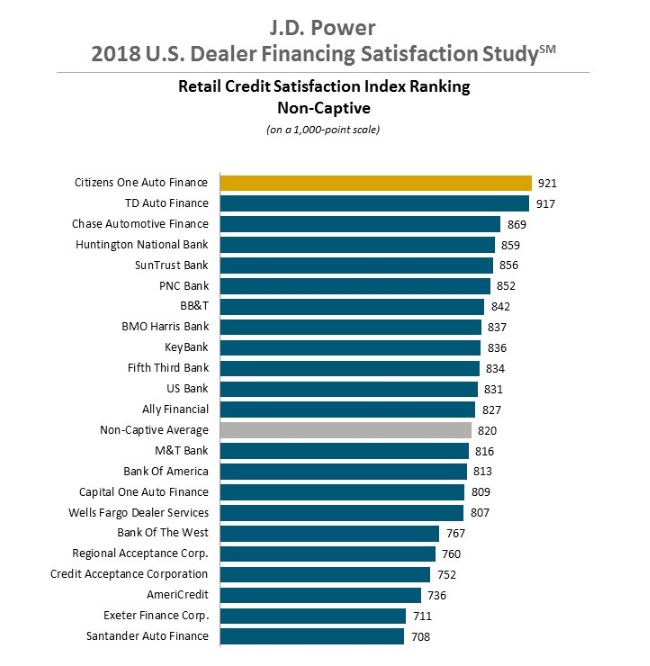 Noncaptive Segment: Citizens One Auto Finance ranks highest in overall dealer satisfaction (921), followed by TD Auto Finance (917), and Chase Automotive Finance (869).
