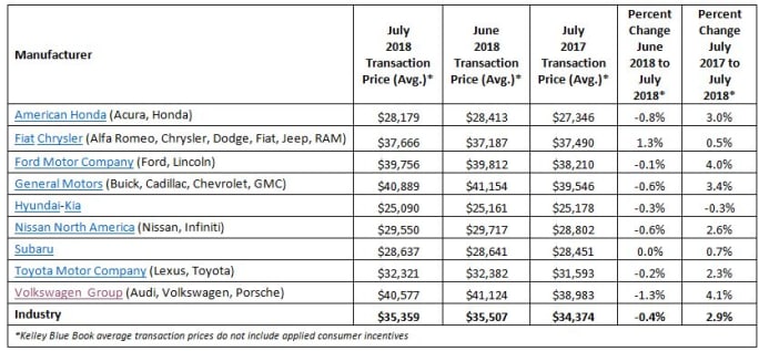 IRVINE, Calif. — Thanks to market demand quickly backing away from cars, average transaction prices in July rose 2.9% from a year ago, or $985, to $35,359, Kelley Blue Book reported this week.