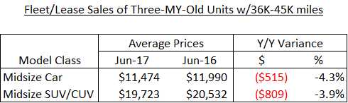 “Price softening continues to be evident when holding constant for sale type, mode-year age, mileage, and model-class segment,” Kontos added. “As the table show, average prices for both of these two bellwether car and truck segments were down by about 4% year over year, reflecting growth in off-lease supply.”
